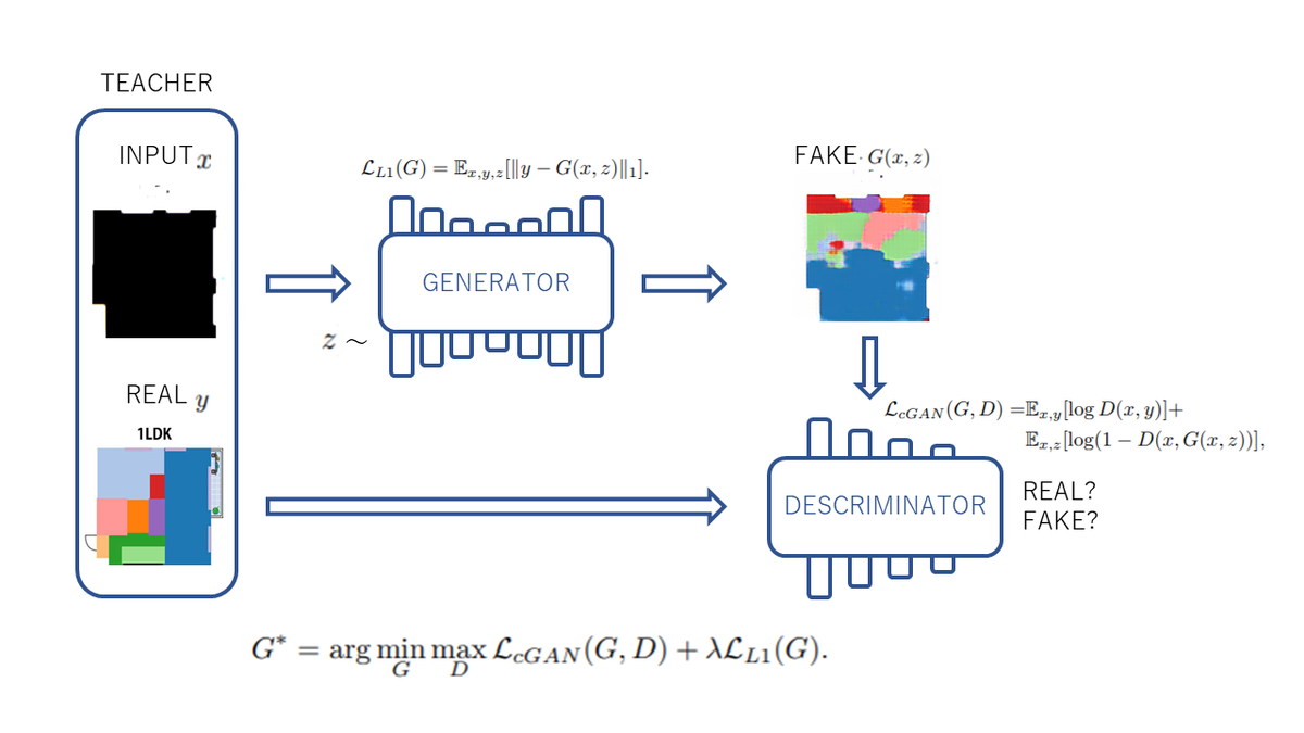 今回はGANの中でもpix2pix[3]という教師あり学習で画像から画像の生成を学習するモデルを使用し、ArchiGANの手順に従って、model2にあたる部分、見取り図を黒く塗りつぶしたものから部屋を生成して色付けをするタスクを行い、ベースラインを作成しました。