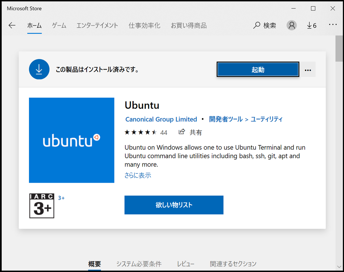WindowsでLinux環境をつくるにはいくつか方法があるようですが、Ubuntuを使うのが良いと思います。Ubuntuのインストールはhttps://ubuntu.com/tutorials/tutorial-ubuntu-on-windows#1-overview を見ると非常に分かりやすいですが、Microsoft StoreでUbuntuを検索し、インストールをクリックし、あとはポップアップの指示に従えば完了できます。(写真では、私のPCではインストール済のため、”インストール”ではなく”起動”となっています。)